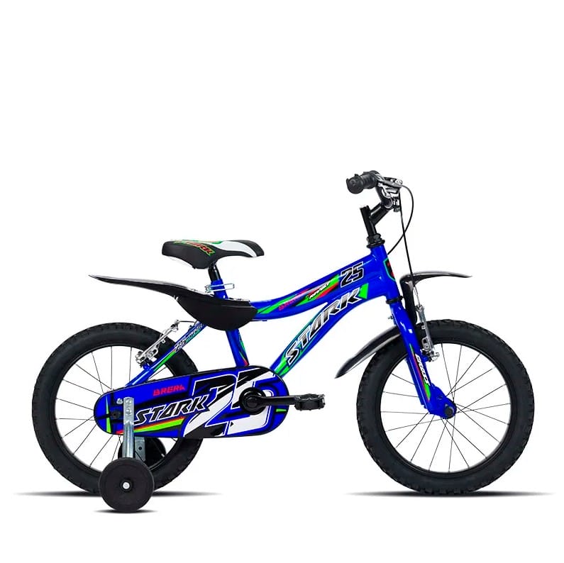 Bimbo 16 pollici, freni in alluminio V-brake, ruote alluminio, paracatena, parafanghi, borraccia e campanello.